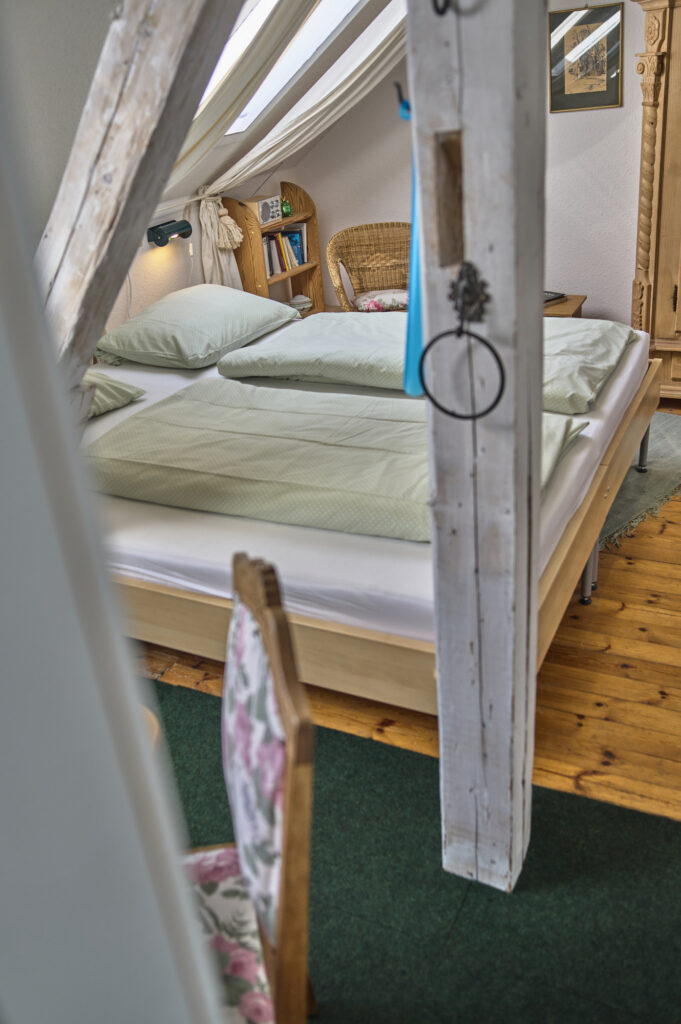 1 Doppelbett, schöner Naturholz-Kleiderschrank, Tisch und Stühle, ein kleiner gemütlicher Bereich ist vom Schlafbereich durch ein altes, offenes Gebälk abgeteilt. Das Zimmer hat eine Dachschräge. Geschirr und Gläser für kleine Brotzeiten und Kaffeemaschine sind vorhanden. Bettwäsche wird passend zum Stil des Zimmers gestellt. Badezimmer mit Dusche, WC, ein schöner alter Tisch mit einem grünen Aufsatzwaschbecken aus Glas. Fön und Handtücher werden gestellt. Bademäntel auf Wunsch.